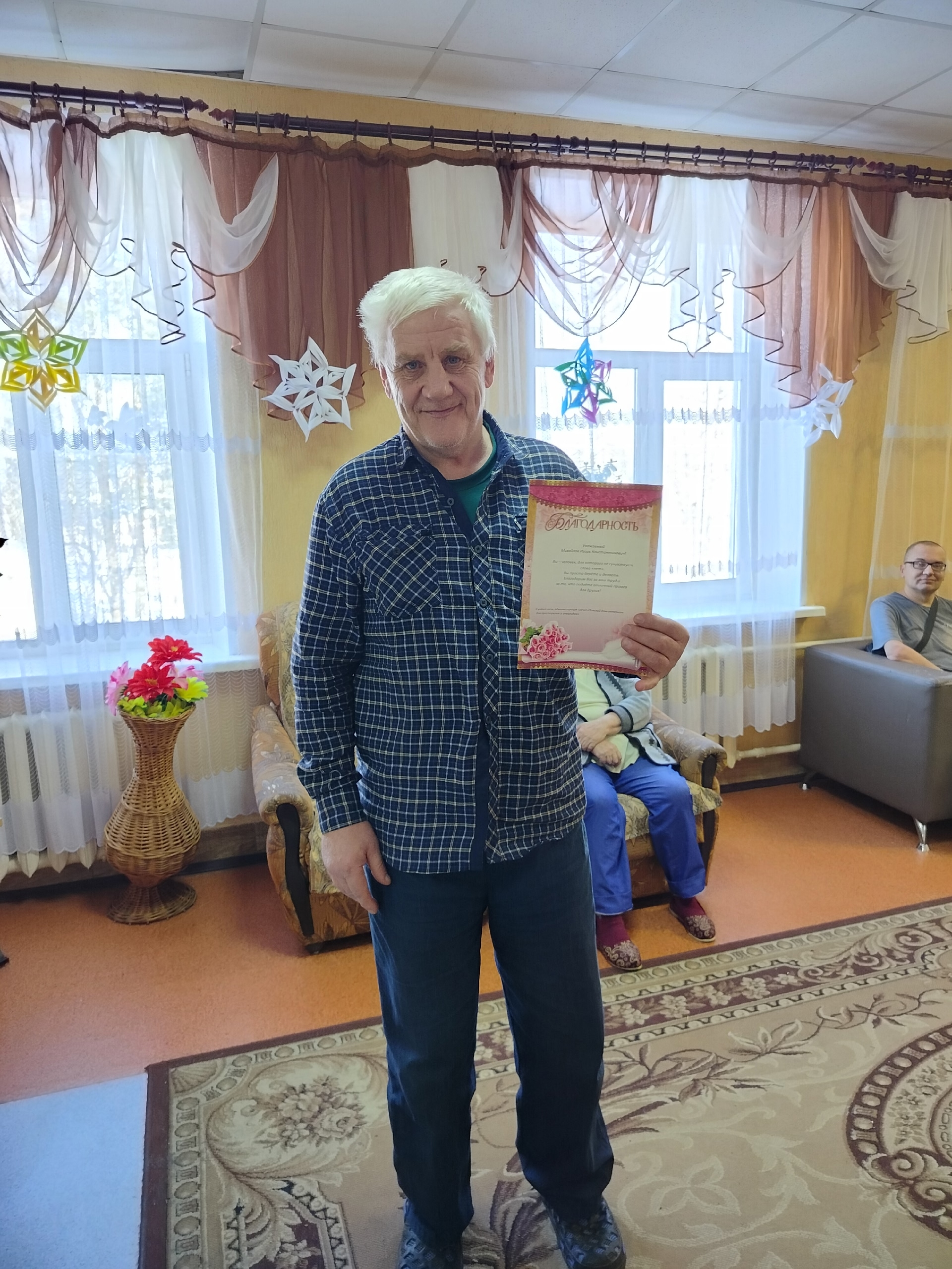 Сегодня мы поздравили своих мужчин с праздником 23 февраля. Всем были вручены подарки. А самому трудолюбивому нашему проживающему, Игорю Константиновичу, вручили Благодарность!